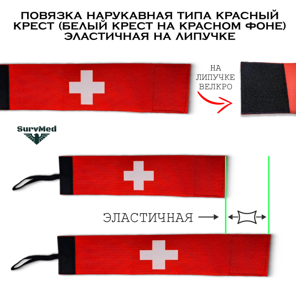 Повязка нарукавная типа Красный крест - это эластичная повязка на липучке в сигнальном ярком красном цвете с белым крестом, символизирующем первую помощь для обозначения медика или спасателя.