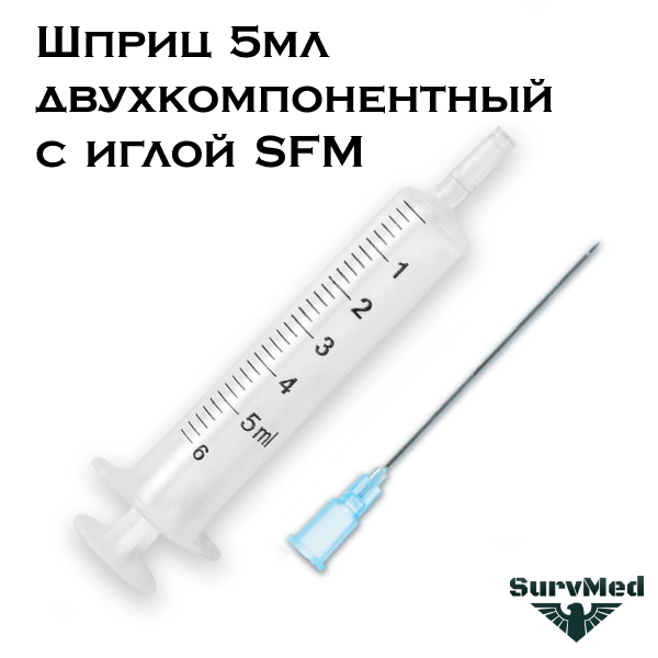 Шприц 5мл двухкомпонентный с иглой SFM предназначен для введения различных лекарственных жидкостей пострадавшему - например при уколах обезболивающего или витаминов или иных видов лекарств.