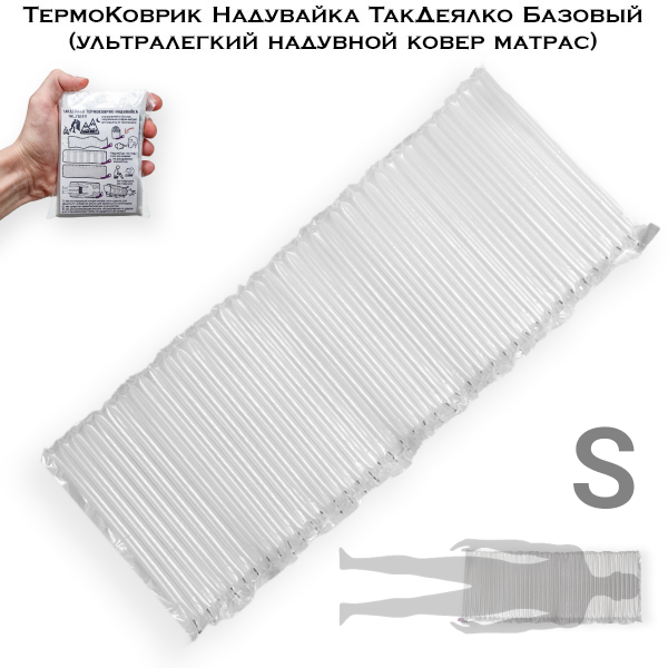 Термоковрик Надувайка Такдеялко в размере Small (маленький) - это самый компактный размер. В сложенном состоянии он почти не занимает места в аптечке (вес всего 48 грамм) и размером с ладонь без пальцев. В надутом виде он защищает от холода большую часть тела: от головы до бедер, сохраняя тепло ядра, головы и жизненно важных органов.