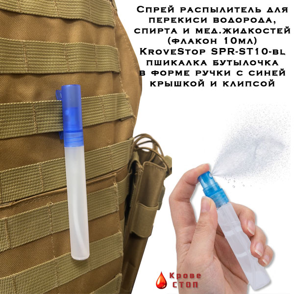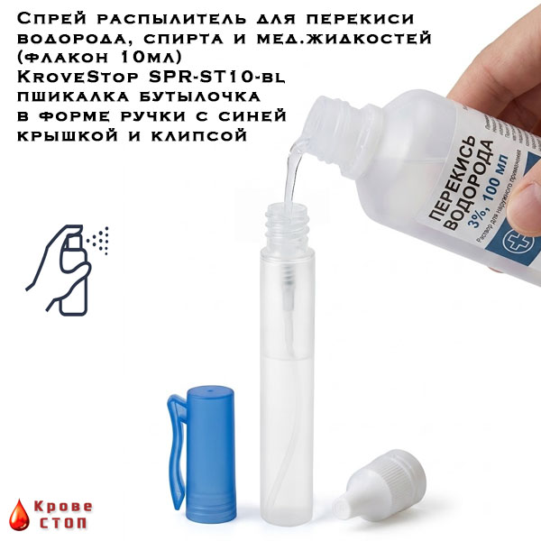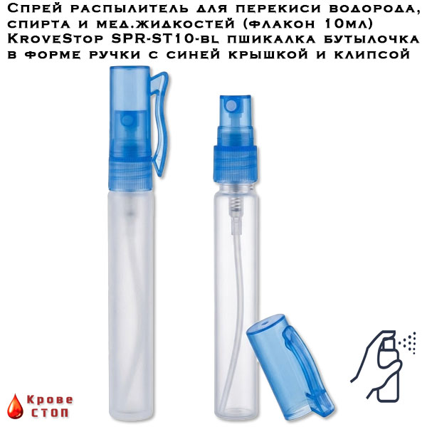 Спрей распылитель для перекиси водорода, спирта и мед.жидкостей (флакон 10мл) KroveStop SPR-ST10-bl пшикалка бутылочка в форме ручки с синей крышкой и клипсой