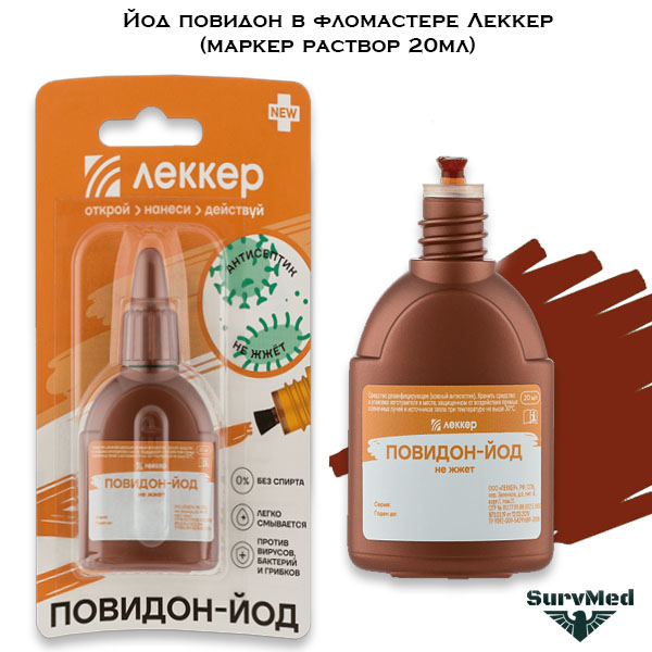 Йод повидоновый в фломастере Леккер - это фломастер (маркер) с раствором повидон йода 20мл для дезинфекции кожи.