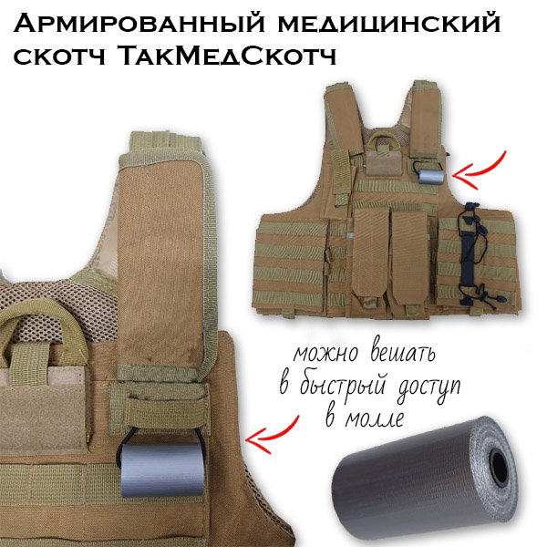 Просто обмотайте Тактическим Медицинским Армированным Скотчем повязку - и можете забыть про нее до прибытия в госпиталь. Он не порвется и не начнет сползать или ослабляться, в отличии от тканевых или самолипнущих средств фиксации.