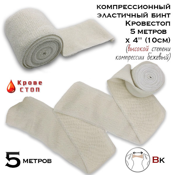 Бинт эластичный компрессионный Кровестоп ВК 5 метров х 4" (10см) (высокой степени компрессии) бежевый