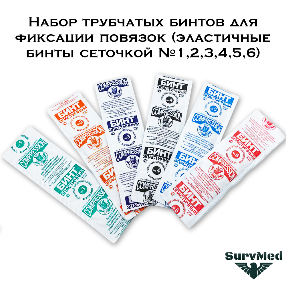 В набор входит 6 трубчатых бинтов сеточкой разного размера: от самого маленького до самого большого. Они универсально подходят для применения на разных частях тела. Вне зависимости от размера раны и её местонахождения, с помощью набора разных размеров трубчатых бинтов получится зафиксировать любую повязку. При необходимости можно будет взять размер побольше или поменьше, чтобы перевязка была зафиксирована плотно, не болталась и не сползала.