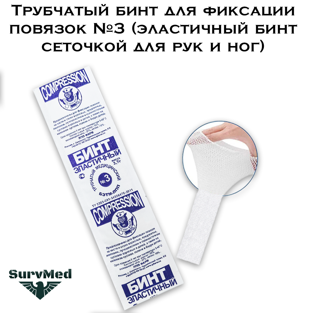 Трубчатый бинт для фиксации повязок  - это специальный эластичный медицинский бинт-сеточка для фиксации перевязочных материалов. Размер №3 предназначен для ступней, верхней части руки и нижней части ноги.