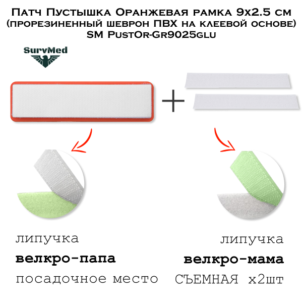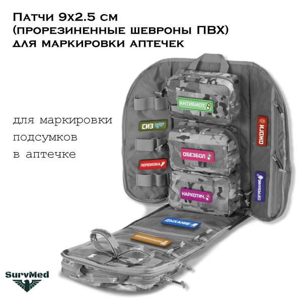Патчи используются как опознавательный знак для наборов первой помощи, чтобы разграничить медсредства по сферами применения. Их можно крепить на экипировку, у которой нет посадочных мест с липучкой велкро.