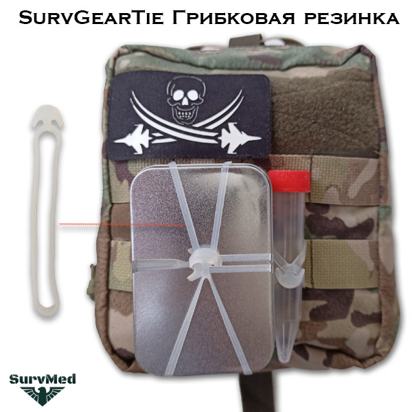 Грибковые резинки SurvGearTie предназначены для фиксации экипировки и мелких предметов. С их помощью можно прикрепить предмет к ячейкам MOLLE, улучшить внутреннюю организацию подсумков или рюкзаков, навесить дополнительные средства на лямки рюкзака, разгрузки или пояса.