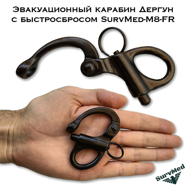 Эвакуационный карабин Дергун SurvMed-M8-FRС - это карабин с системой быстрого сброса, который можно открывать рывком за кольцо даже под нагрузкой.