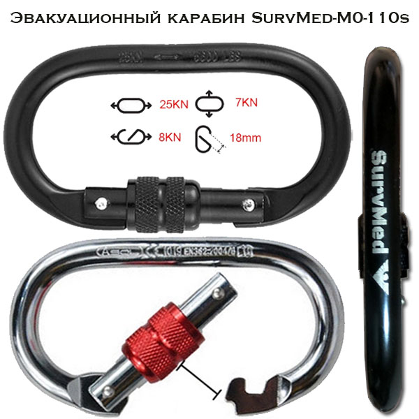 Эвакуационный карабин SurvMed-M0-110s - это прочный альпинистский карабин с муфтой, выдерживающий вес и давление до 25kN (2.5 тонны).