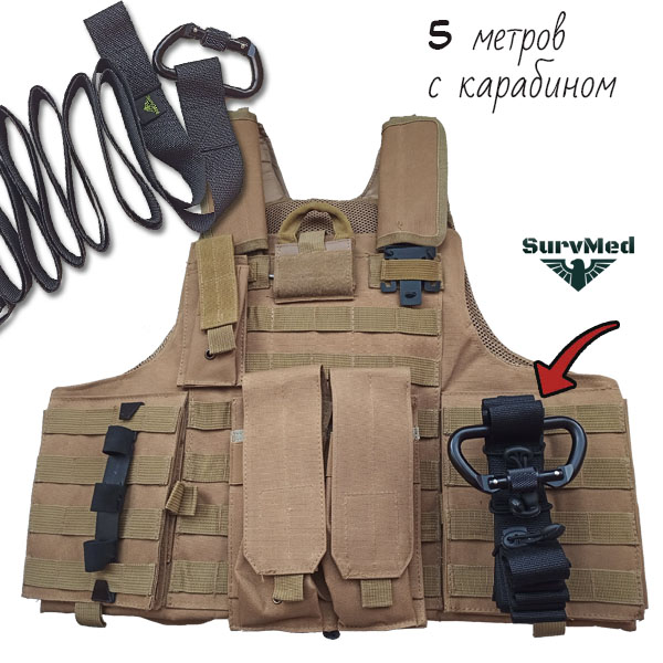 К одному из концов эвакуационной стропы SurvMed пристегнут эвакуационный карабин SurvMed. С его помощью можно быстро прищелкивать стропу к бронежилету, разгрузке или поясу пострадавшего, либо оборачивать стропу вокруг пояса или подмышками и защелкивать саму на себя.