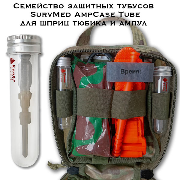 Ударопрочный кейс SurvMed AmpCase Tube выполнен в форме вертикальной колбы-футляра, крепящейся под резинку в аптечку. Также возможно прикрепить петлю для подвеса и переносить колбу на шнурке или вешать куда-либо (петля приобретается отдельно, см. соседний товар).