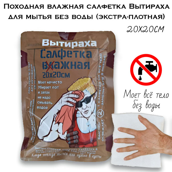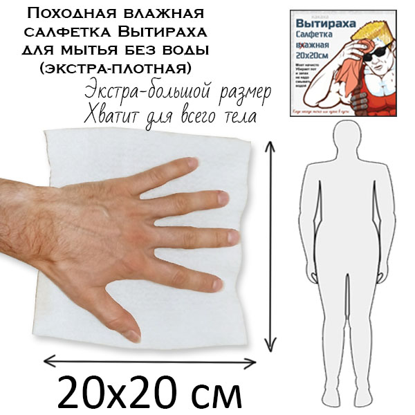 Походная влажная салфетка Вытираха - это экстра-плотная полотенце-салфетка большого размера 20х20см для мытья без воды в походных условиях.