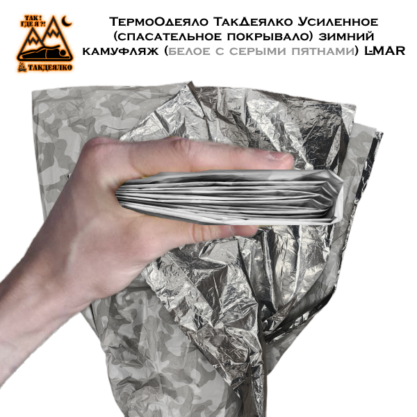 Спасательное покрывало ТакДеялко Усиленное (зимний камуфляж ТермоОдеяло L-MAR) - это теплоотражающее ультратонкое и ультралегкое пленочное одеяло, которое отражает тепло тела обратно. Оно помогает снизить потери тепла в ситуациях, когда возможна гипотермия (переохлаждение).