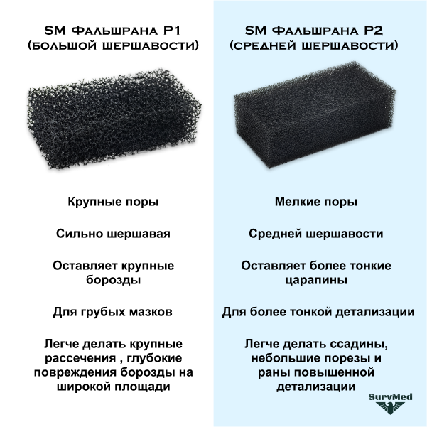 Губка спонж Сурвмед Фальшрана Р1 предназначена для создания фальшивых кровопотеков, шрамов и ссадин при работе с гримом и искусственной кровью. С помощью шершавой губки можно текстурировать поверхность нанесенного макияжа, изобразив на нём борозды, неровности, углубления канавки или шагрень. Это позволяет имитировать содранную кожу, кровоточащие рваные раны, травматические повреждения мягких тканей и прочие виды ран для занятий по первой помощи или розыгрыша друзей.