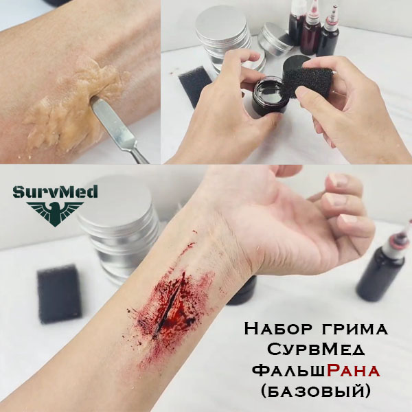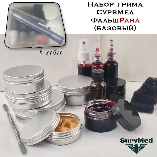 Набор грима СурвМед ФальшРана - это комплект из 11 предметов для создания фальшивых ран для тренировок первой помощи или съемок кино.