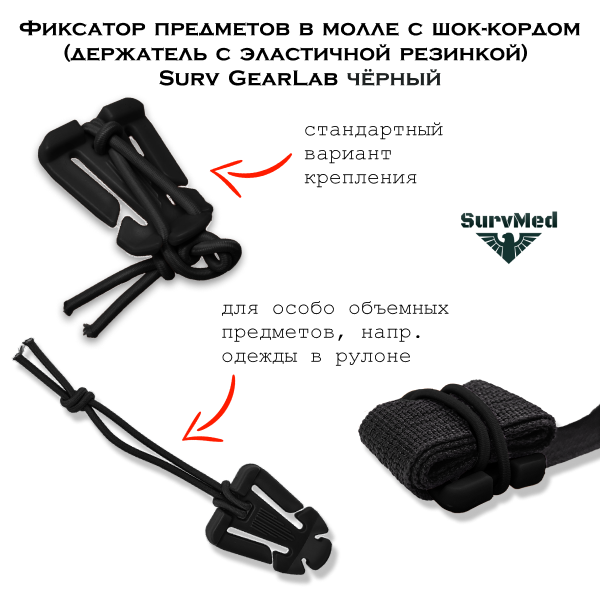 Фиксатор предметов в молле с шок-кордом Surv GearLab черный - это держатель с эластичной резинкой для крепления и подвешивания на экипировке в ячейках MOLLE