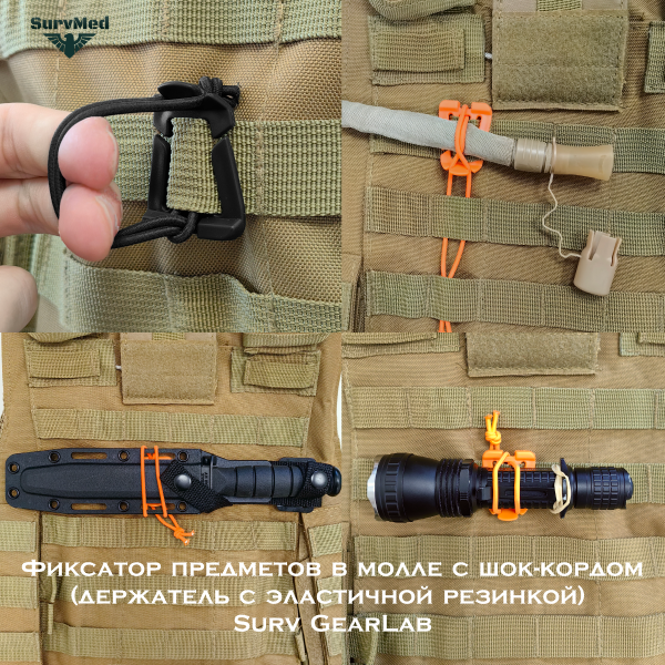Фиксатор предметов в молле с шок-кордом Surv GearLab также пригодится для организации внутреннего пространства в аптечках или админ-панелях, фиксации свободных концов строп на лямках рюкзака и прочих местах.