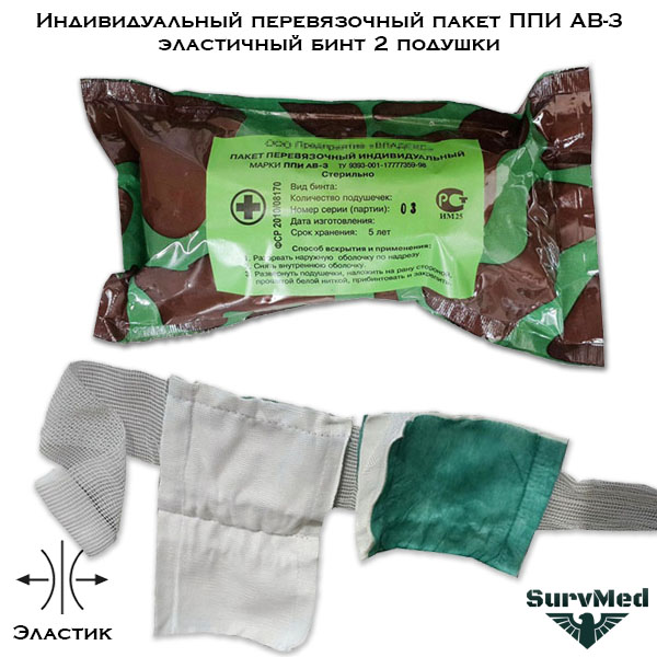 Индивидуальный перевязочный пакет ППИ АВ-3 эластичный бинт 2 подушки