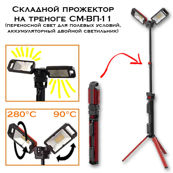 Складной прожектор на треноге СМ-ВП-11 (переносной свет для полевых условий, аккумуляторный двойной светильник)