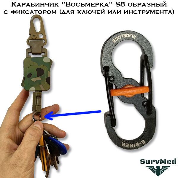 Карабинчик "Восьмерка" S8 с фиксатором предназначен для крепления ключей и инструмента на связку в форме буквы S. Благодая стопору, конструкция блокирует случайное раскрытие и не снижает шансы выскальзывания или падения пристегнутых вещей или предметов.