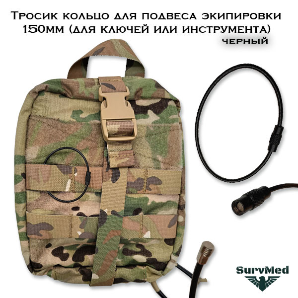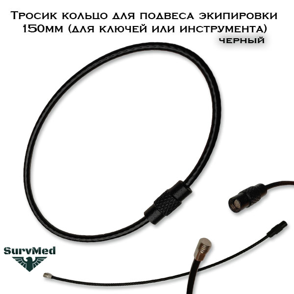 Черный тросик для подвеса экипировки 150мм - это металлическое кольцо для крепления ключей или инструмента.