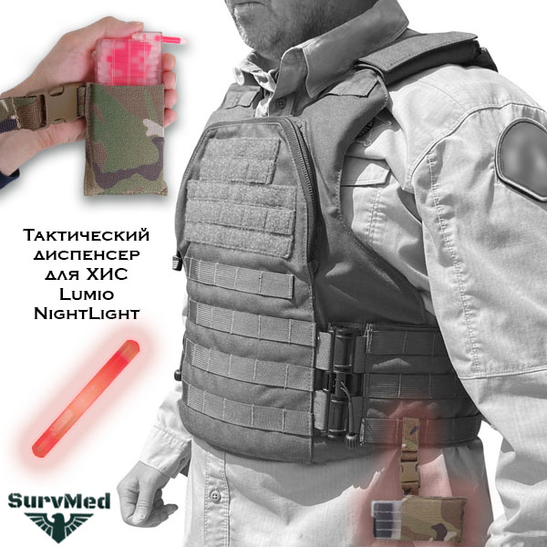 Тактический диспенсер для ХИС Lumio Nightlight позволяет маркировать объекты, предметы или рельеф местности прямо на ходу. Положив на него кисть руки, можно одним движением пальца сдвинуть светящуюся палочку вперед, фиксируя её в ложе магазина. Затем, надломив её о выступ магазина, сбросить или аккуратно положить на нужное место. Всё это делается одной рукой, оставляя вторую свободной под оружие, компас, бинокль, пнв и прочее.