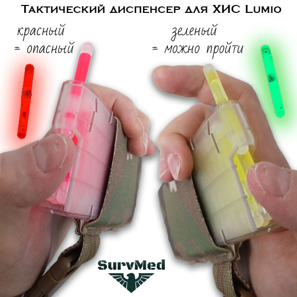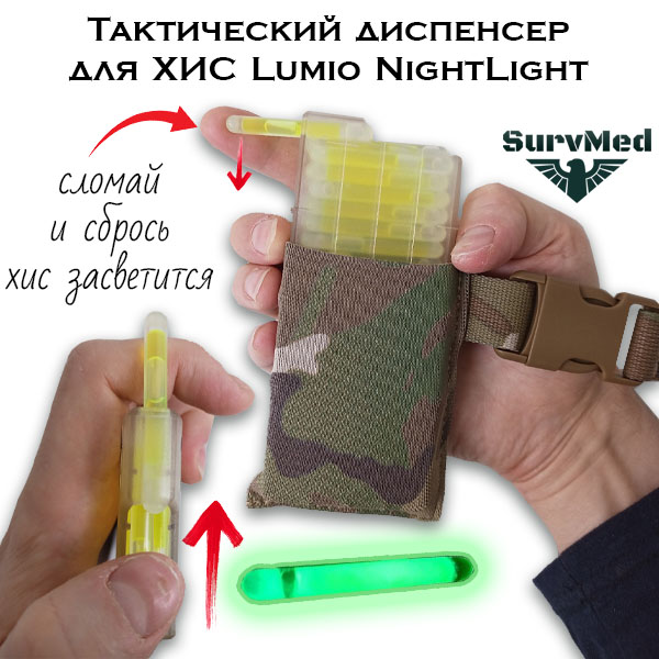 Тактический диспенсер для ХИС Lumio Nightlight позволяет маркировать объекты, предметы или рельеф местности прямо на ходу. Положив на него кисть руки, можно одним движением пальца сдвинуть светящуюся палочку вперед, фиксируя её в ложе магазина. Затем, надломив её о выступ магазина, сбросить или аккуратно положить на нужное место. Всё это делается одной рукой, оставляя вторую свободной под оружие, компас, бинокль, пнв и прочее.