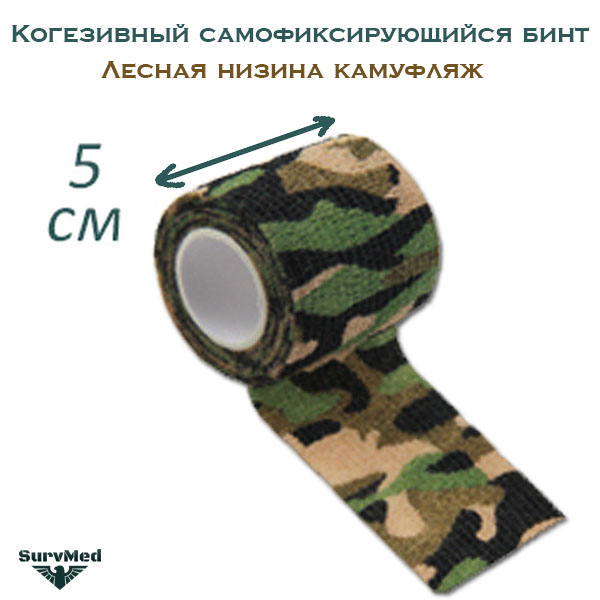 Когезивный бинт СурвМед лесной камуфляж 5 см - это универсальный самоклеющийся бинт для фиксации повязок и перевязочных материалов.