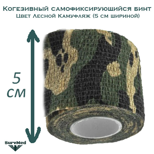 Когезивный бинт СурвМед лесной камуфляж 5 см - это универсальный самоклеющийся бинт для фиксации повязок и перевязочных материалов.