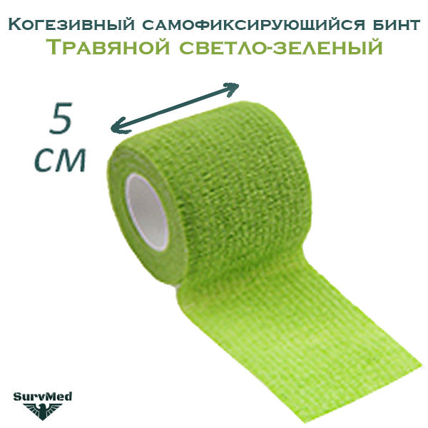 Когезивный бинт СурвМед травяной светло-зеленый 5 см - это универсальный самоклеющийся бинт для фиксации повязок и перевязочных материалов.