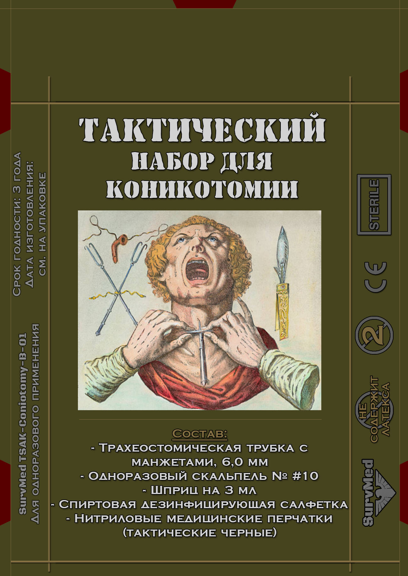 Для выполнения данной операции используется Набор для хирургии дыхательных путей, по другому называемый набором для коникотомии. Он содержит все необходимое для успешного создания канала искусственной вентиляции дыхательных путей.