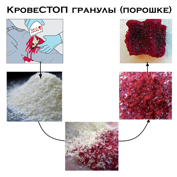 Гемостатические гранулы КровеСтоп предназначены для экстренной остановки кровотечения из жизнеугрожающих ранений. Они имеют пропитку из хитозана - специального биополимерного средства, обладающего гемостатической активностью и ускоряющего сворачивание крови. При контакте с кровью порошок КровеСтоп в считанные минуты образует гелеобразный сгусток, создающий давление на кровоточащий сосуд и останавливающий кровотечение.