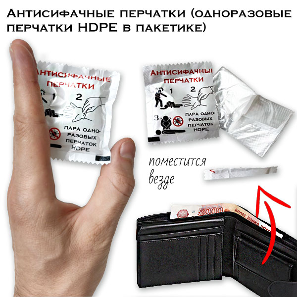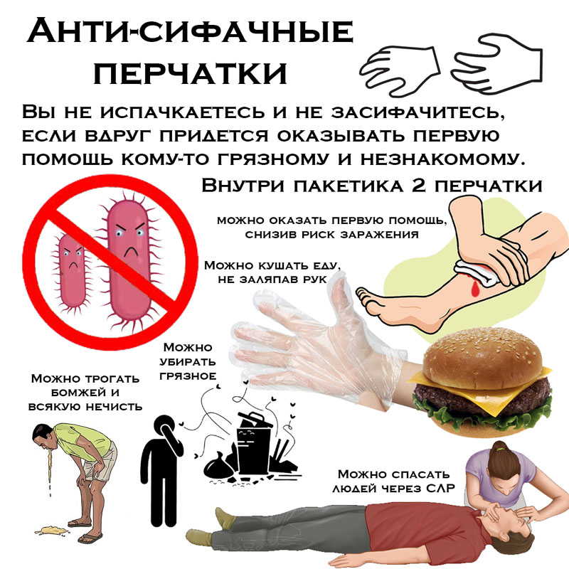 Антисифачные перчатки предназначены для защиты рук от различных загрязнений, инфекций и заражений. С их помощью можно не засифачиться об пострадавшего, если понадобится оказать первую помощь незнакомому человеку.