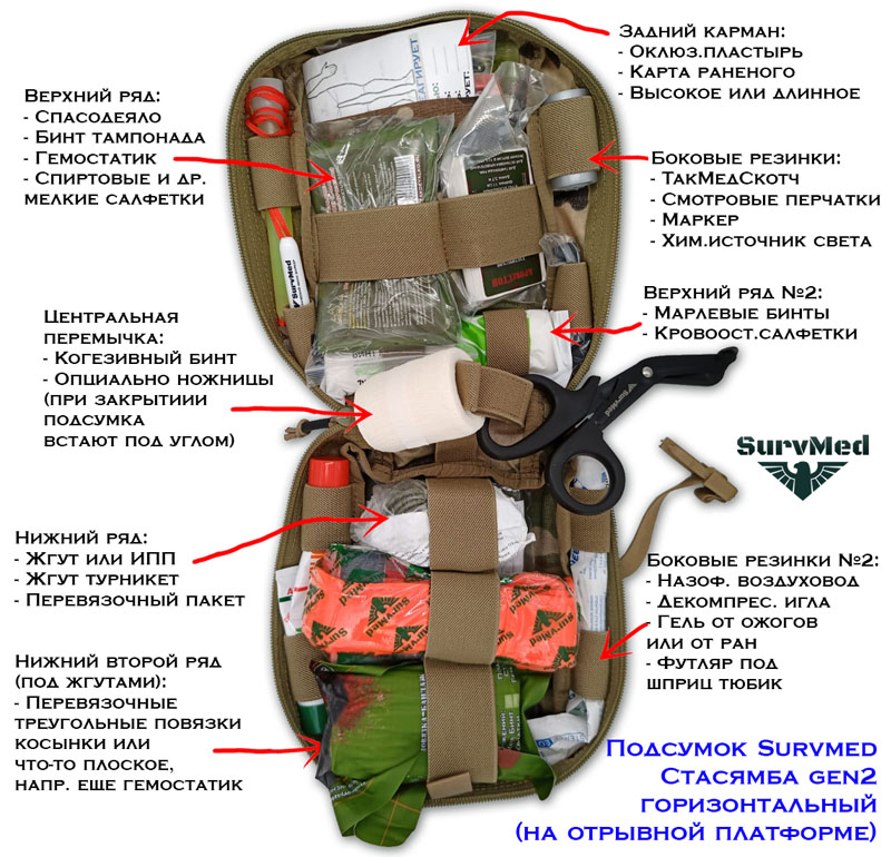 - 1 глубокий задний карман (у задней стенки) - под гемостатические бинты, герметики (окклюзионные пластыри), ножницы и др. длинные вещи.