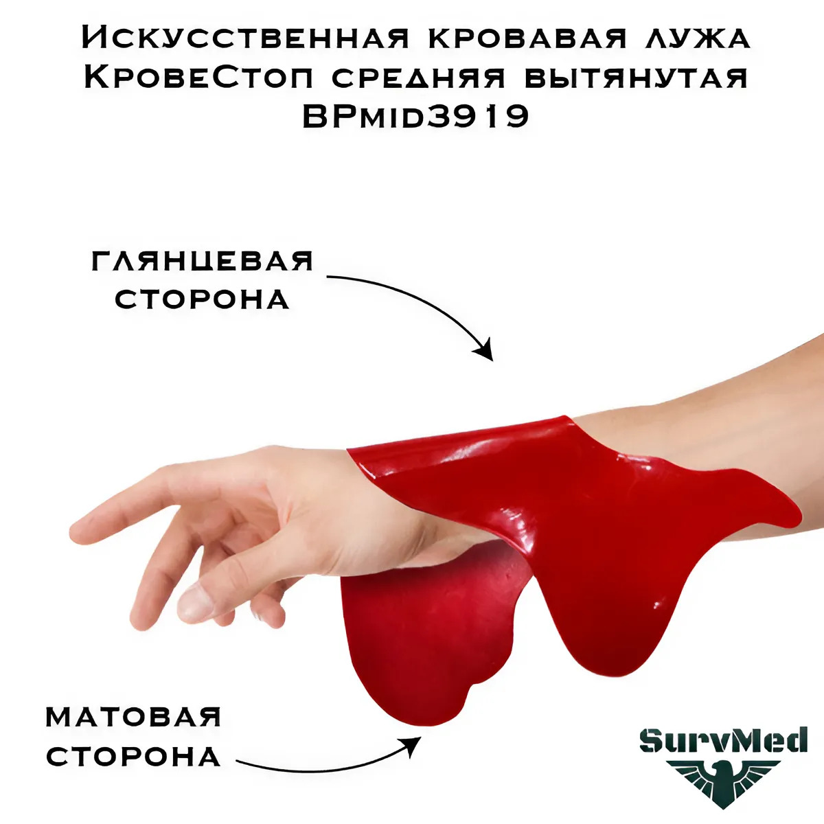 Искусственная кровавая лужа КровеСтоп BPmid3919 — это вытянутая средних размером мягкая кровавая накладка муляж для тренировок по первой помощи и запугивания друзей.