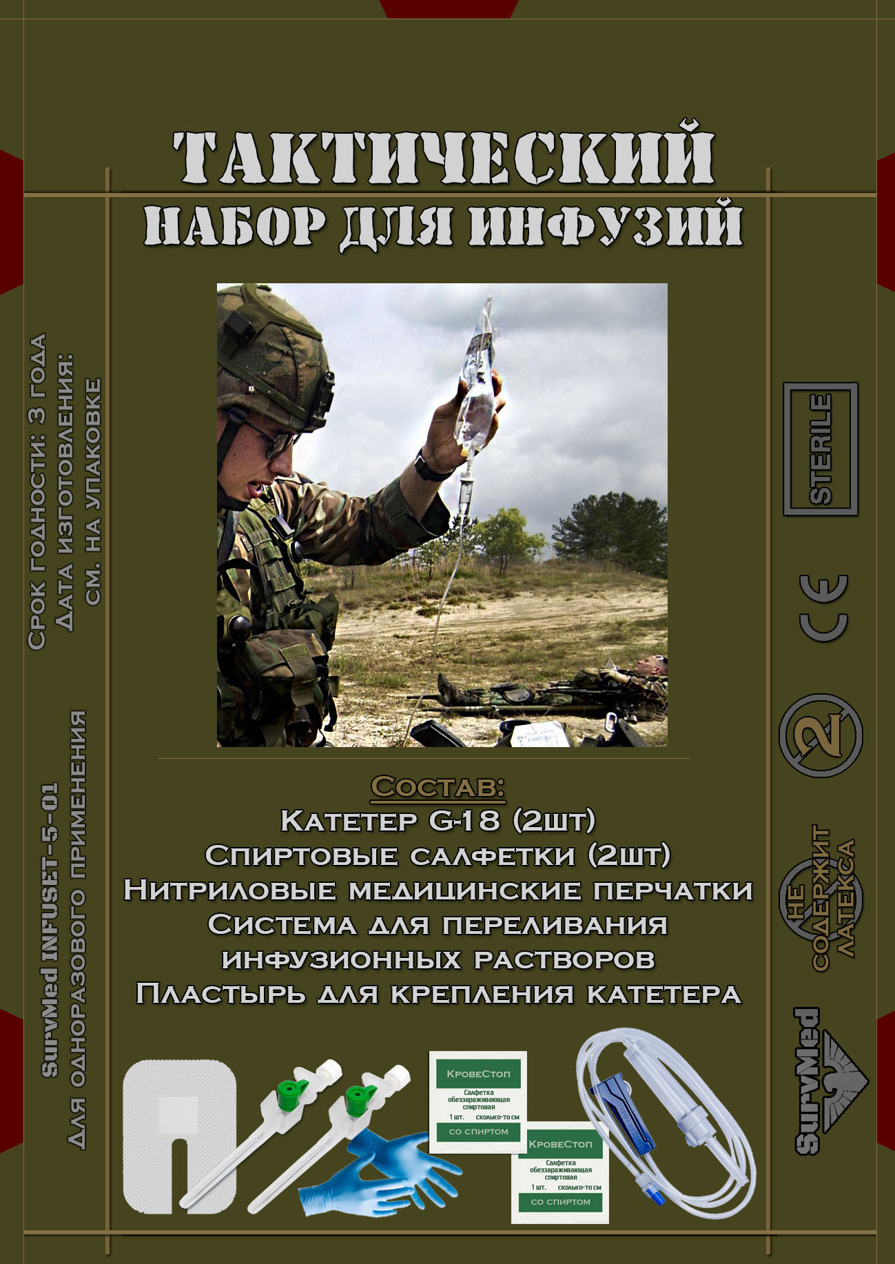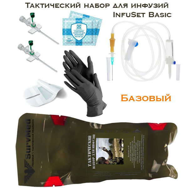 Тактический набор для инфузий СурвМед предназначен для катетеризации периферических вен и создания внутривенного доступа для проведения внутривенного вливания. Он позволяет обеспечить доступ в кровяное русло для введения лекарственных препаратов и\или кровезаменителей.