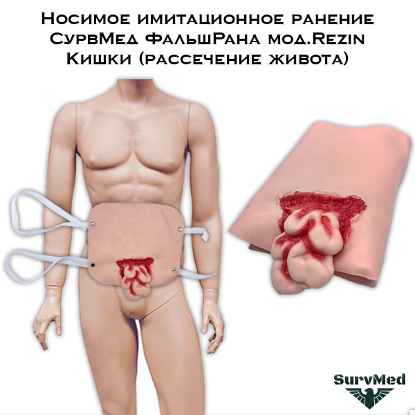 Носимое имитационное ранение СурвМед ФальшРана мод.Rezin "Кишки" (рассечение живота) - это раневая накладка для отработки навыков первой помощи при ранениях брюшной полости.