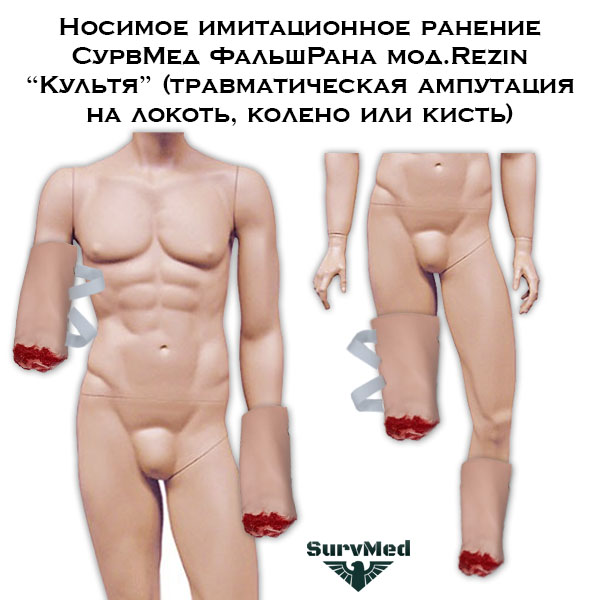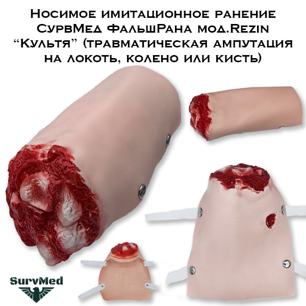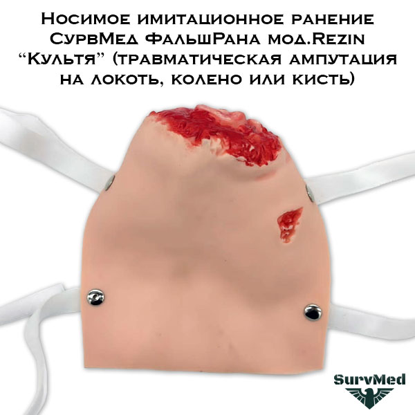 Носимое имитационное ранение СурвМед ФальшРана мод.Rezin “Культя” (травматическая ампутация на локоть, колено или кисть) - это раневая накладка для отработки навыков первой помощи при ранениях конечностей.