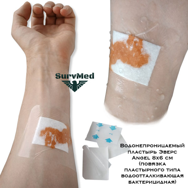 Водонепроницаемые пластырные повязки предназначены для защиты поврежденного места от внешней среды. Они представляют собой пластырь больших размеров для закрытия ран в походных условиях. Их нижняя часть сделана из сорбционной (впитывающей) подушечки, а верхняя - из водоотталкивающей полиуретановой пленки, которая защищает рану от осадков, грязи и непогоды.