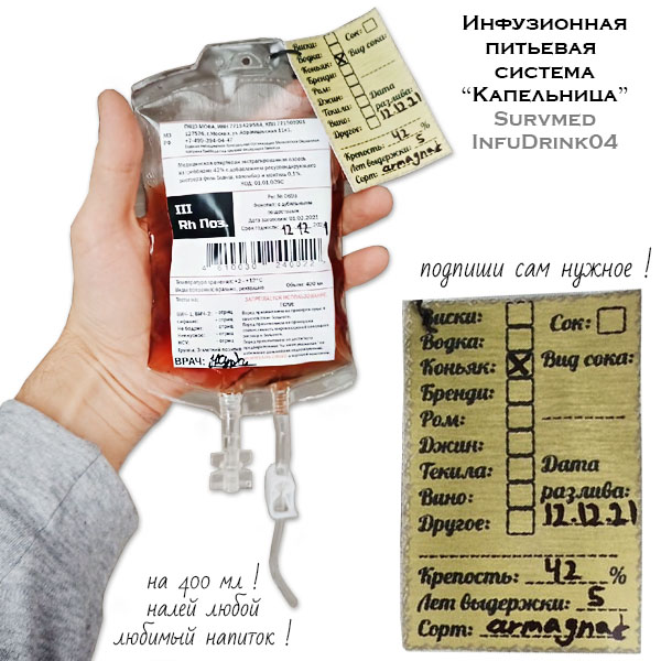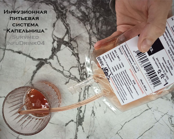 В отличии от лекарственных инфузионных растворов, разлитых на заводе и запечатанных намертво, инфузионная питьевая система СурвМед "Капельница" поставляется пустой и готовой к заправке. Можно заливать любой любимый напиток на свой вкус и цвет, развлекаясь к красно-кровавыми соками или бордово-багровыми горячительными напитками.