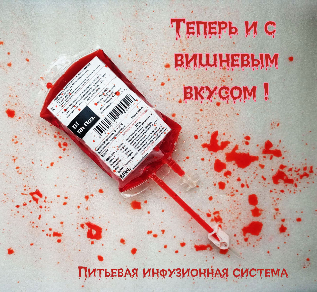 Основная (центральная) этикетка инфузионной питьевой системы "Капельница" повторяет собой этикетку упаковки донорской крови, используемой в лечебных учреждениях.
