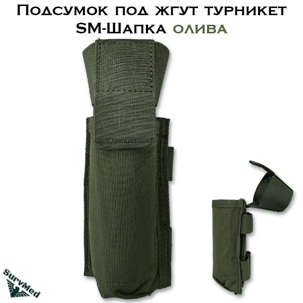 Закрытый подсумок под жгут турникет SM Шапка в оливковом цвете используется для хранения и ношения медицинского турникета (жгута) на снаряжении с возможностью его быстрого извлечения.