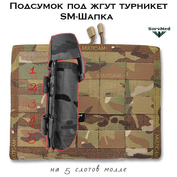 Подсумок под жгут турникет SM Шапка имеет двойное крепление МОЛЛЕ, подходящее на платформы MOLLE, PALS, УМТБС, а также иные виды экипировки - напр. поясные ремни, лямки рюкзака и т.п.