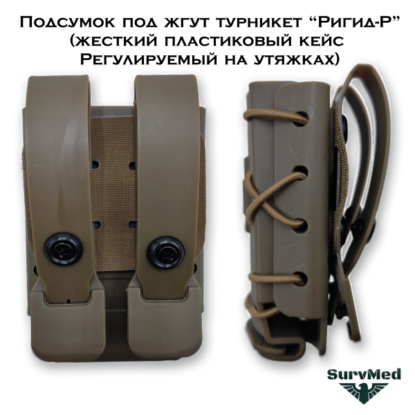 Подсумок под жгут турникет Ригид-Р кор - это жесткий пластиковый кейс Регулируемый на утяжках в коричневом цвете. Крепится на пояс или в molle.