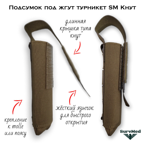 Подсумок SM типа Кнут закрытого типа предназначен для защиты кровоостанавливающего турникета или жгута от внешний воздействий - пыли, грязи, порезов, проколов, атмосферных осадков и воздействия ультрафиолета (выгорания на солнце).