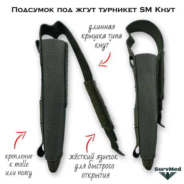 Подсумок SM типа Кнут закрытого типа предназначен для защиты кровоостанавливающего турникета или жгута от внешний воздействий - пыли, грязи, порезов, проколов, атмосферных осадков и воздействия ультрафиолета (выгорания на солнце).
