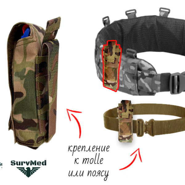 Подсумок под жгут турникет STR-t "Распашонка" имеет стандартное крепление МОЛЛЕ, подходящее на платформы MOLLE, PALS, УМТБС, а также иные виды экипировки - напр. поясные ремни, лямки рюкзака и т.п.