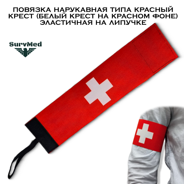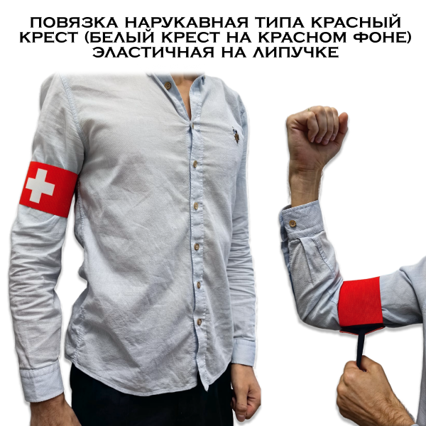Повязка нарукавная типа Красный крест - это эластичная повязка на липучке в сигнальном ярком красном цвете с белым крестом, символизирующем первую помощь для обозначения медика или спасателя.