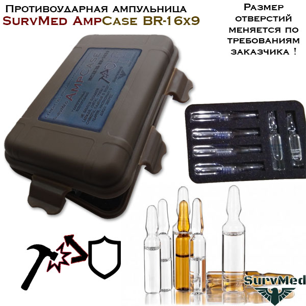 Противоударная ампульница AmpCase BR предназначена для транспортировки и хранения ампул в полевых условиях, приближенных к боевым. Она позволяет размещать и переносить ампулы без боязни разбить их в медицинской сумке, аптечке, рюкзаке фельдшера или иных видах емкостей с мед.имуществом.