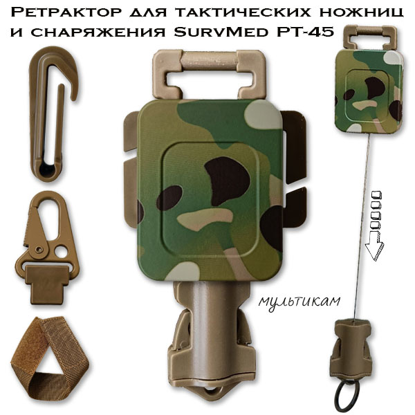 Ретрактор для тактических ножниц и снаряжения SurvMed РТ-45 мк - это вытяжной тросик для экипировки в расцветке мультикам.